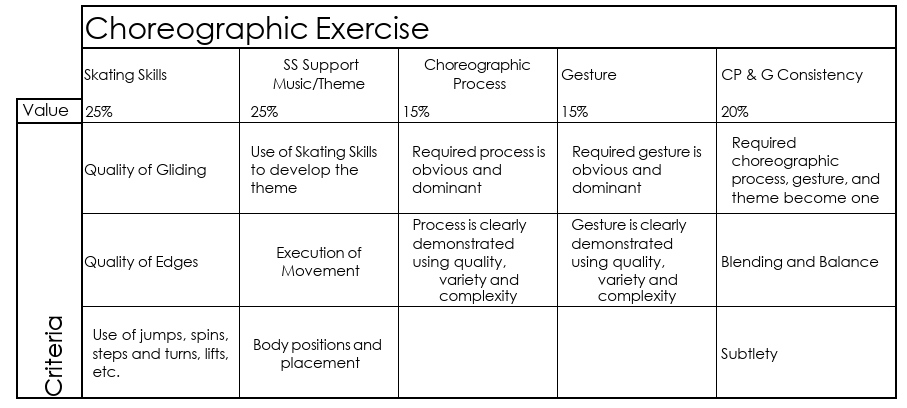 The Component Judging System (CJS) is used at the National Theatre on Ice competition. The CJS uses five marks to evaluate each program. Each mark is evaluated on a scaled of 0-10 outlined below: